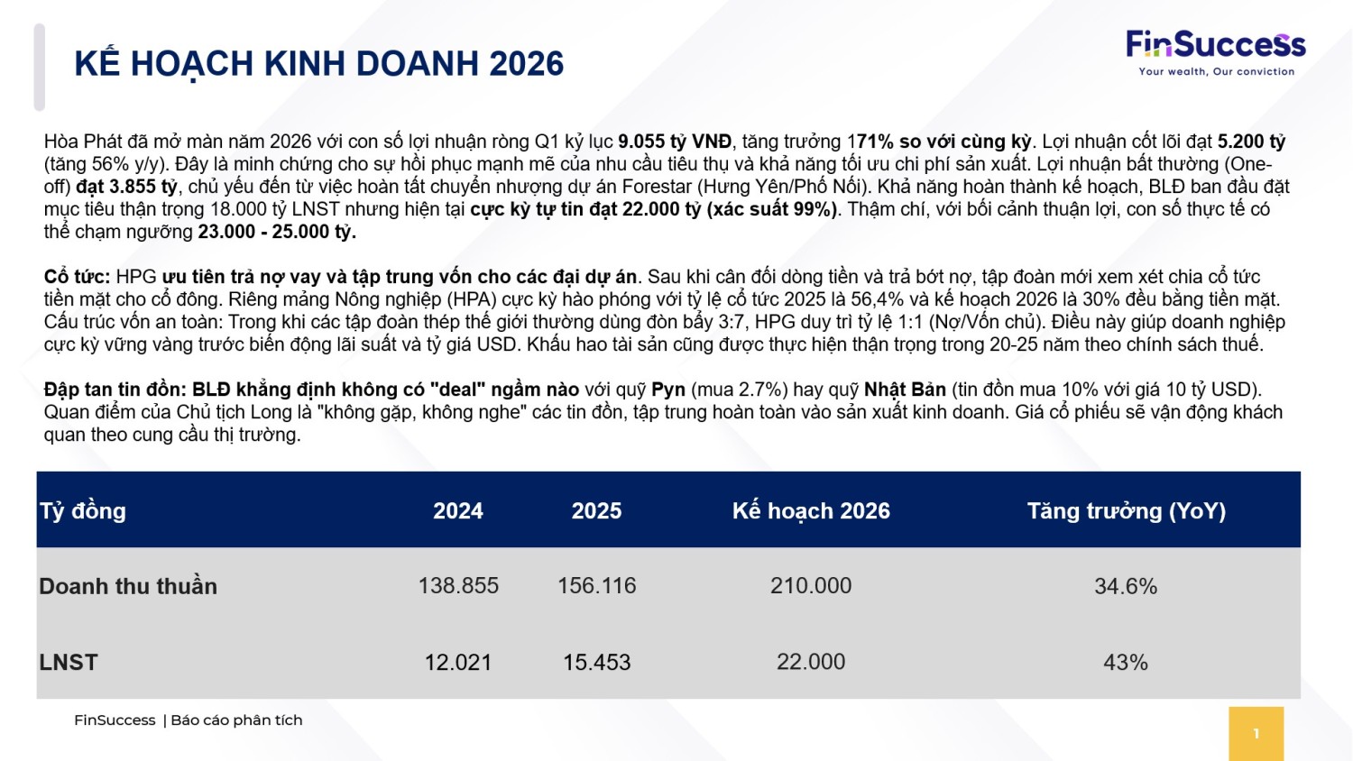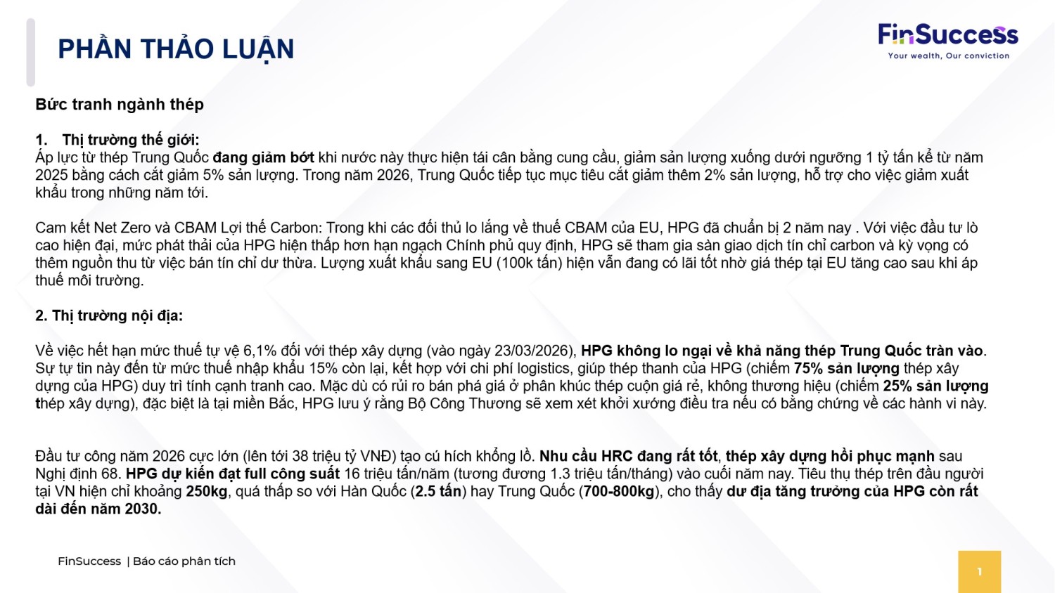 Q1/2026 HPG lãi 9.055 tỷ (5.200 tỷ core, 3.855 tỷ one-off). Đầu vào thuận lợi, nhu cầu thép mạnh nhờ đầu tư công; BLĐ tự tin đạt ~22k tỷ LNST, thậm chí 23.000 - 25.000 tỷ. Giai đoạn 2026–2030 là chu kỳ tăng trưởng mới, mở rộng thép chất lượng cao, HRC và dự án Phú Yên.