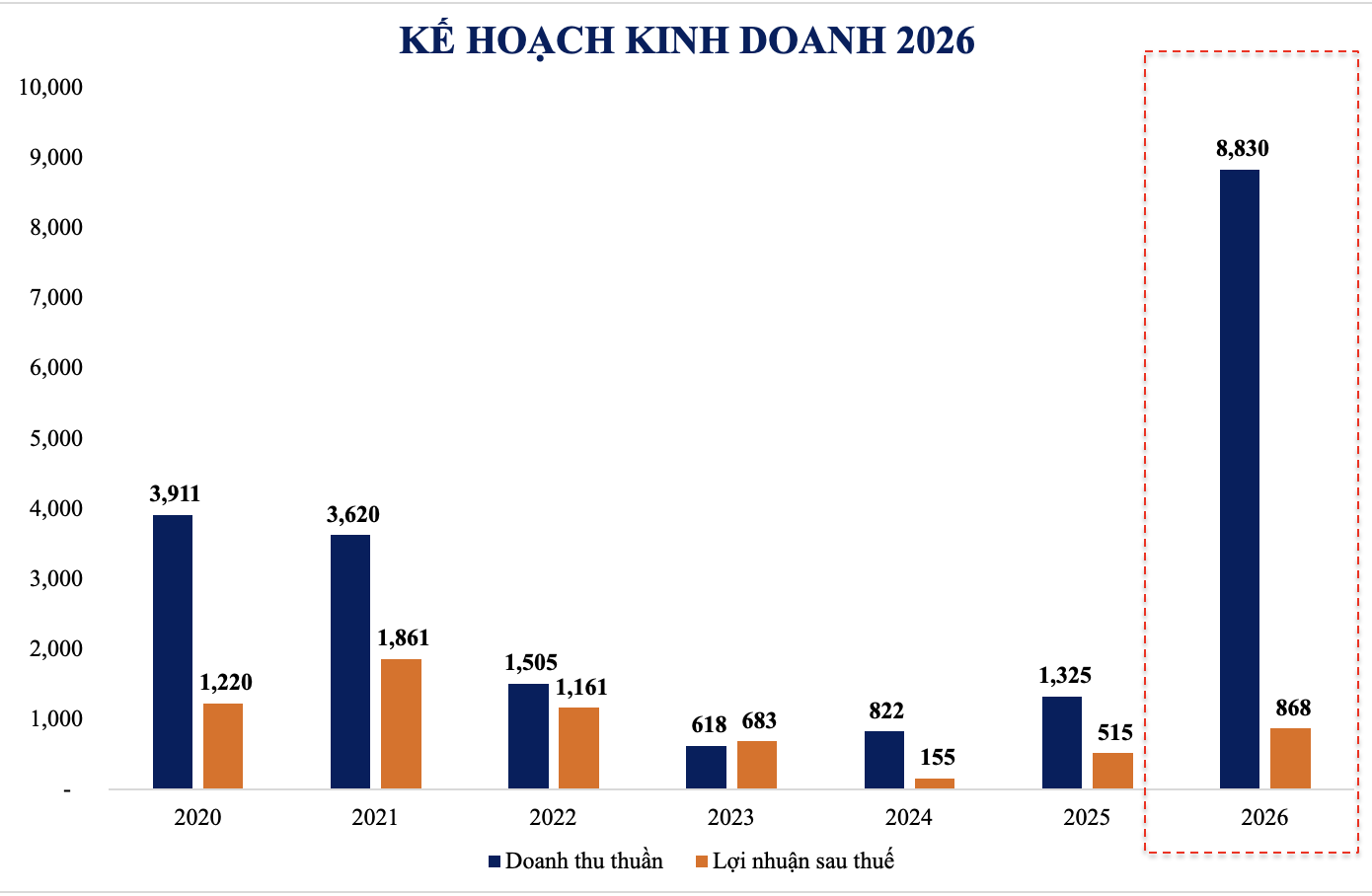 - Tổng doanh thu năm 2026 đạt 8.830 tỷ đồng, trong đó bao gồm doanh thu tài chính và chuyển nhượng cổ phần.