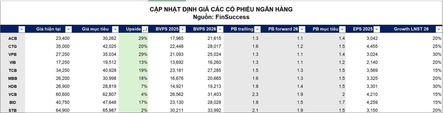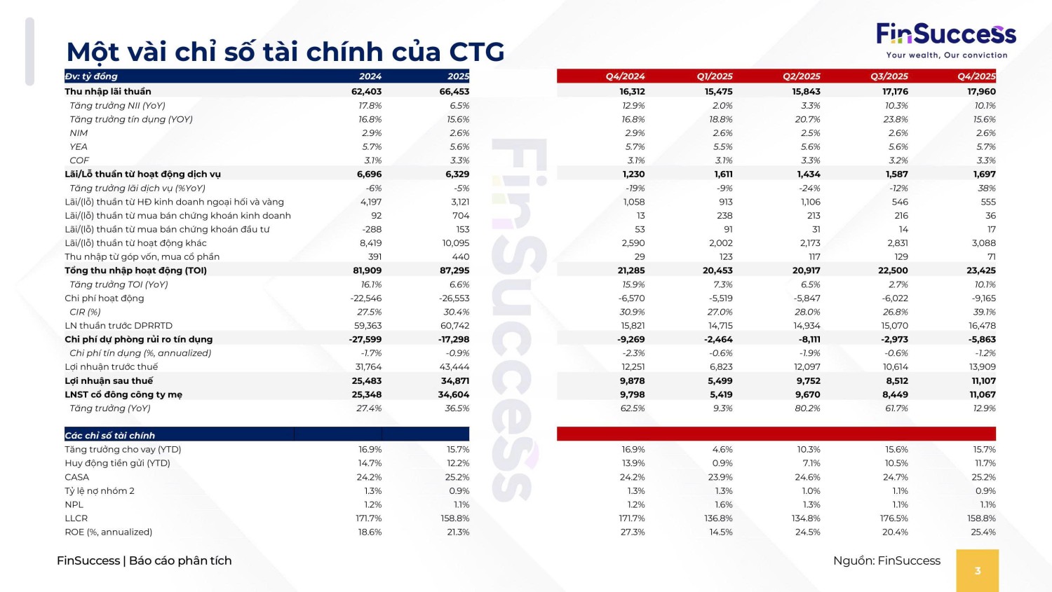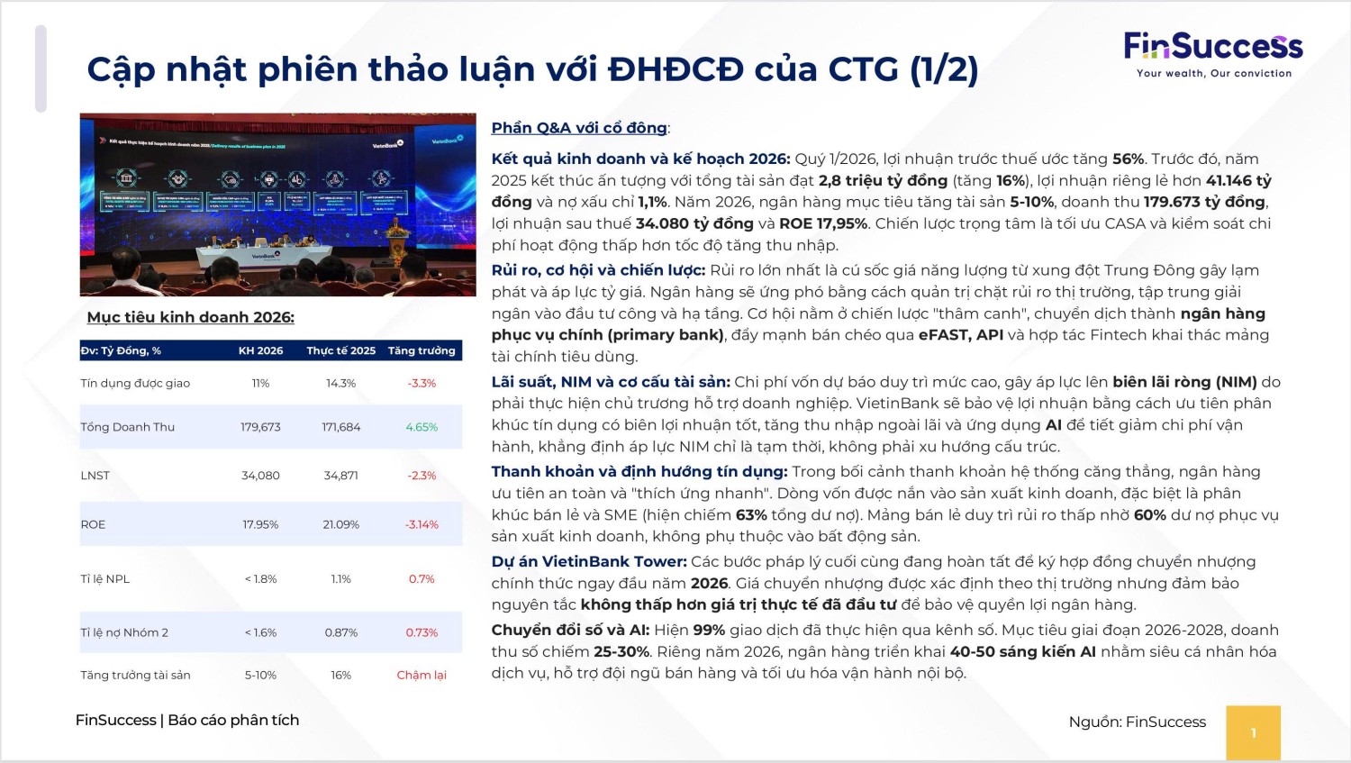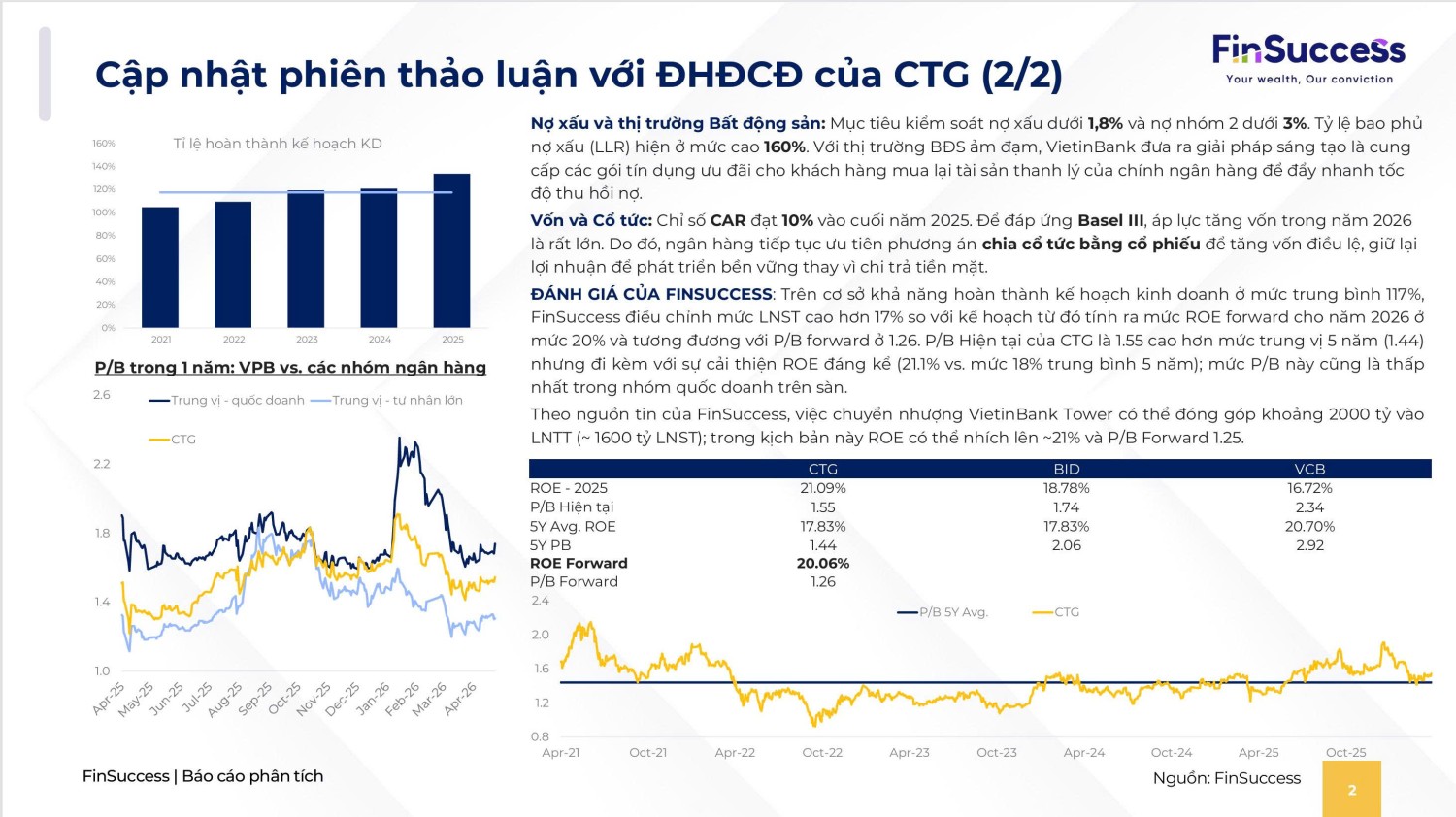 CTG có một kế hoạch kinh doanh khá thận trọng với đa số các chỉ tiêu không "hơn" năm 2025. Nhưng trên cơ sở khả năng hoàn thành kế hoạch kinh doanh ở mức trung bình 117%, FinSuccess điều chỉnh mức LNST cao hơn 17% so với kế hoạch từ đó tính ra mức ROE forward cho năm 2026 ở mức 20% và tương đương với P/B forward ở 1.26, nếu VietinBank Tower thành công chuyển nhượng trong năm nay thì cũng có thể cải thiện cả ROE lẫn định giá, quan trọng hơn mang lại một chút thanh khoản cho CTG trong giai đoạn căng thẳng hiện tại.