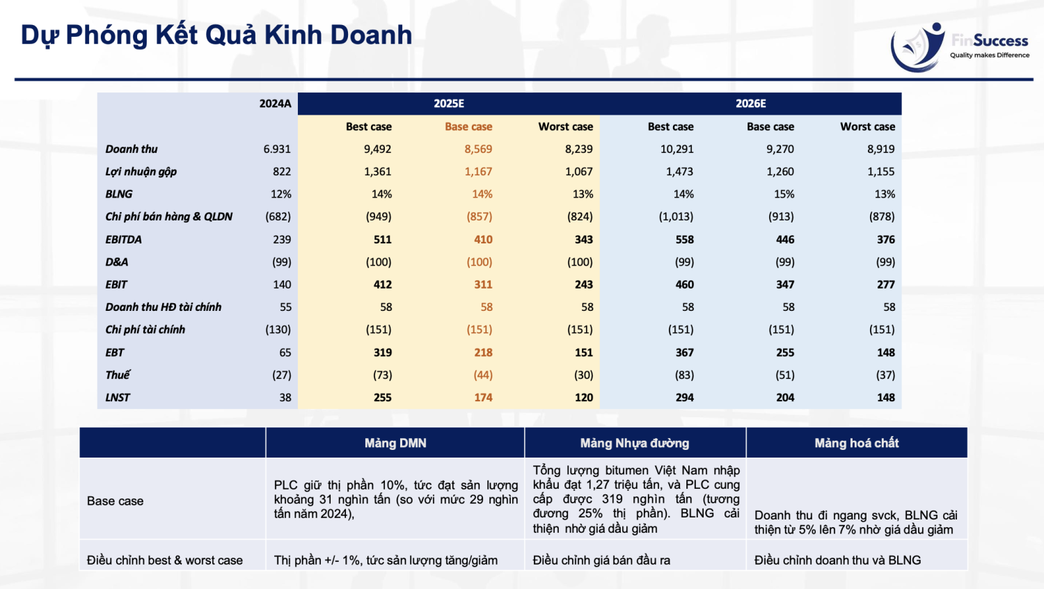 Với các luận điểm: (1) Kế hoạch xây dựng đường cao tốc đang được đẩy mạnh giai đoạn 2025-2030, (2) Giá dầu Brent neo ở vùng thấp, (3) Giá bitumen đầu vào có xu hướng giảm, FinSuccess ước tính trường hợp base case năm 2025: