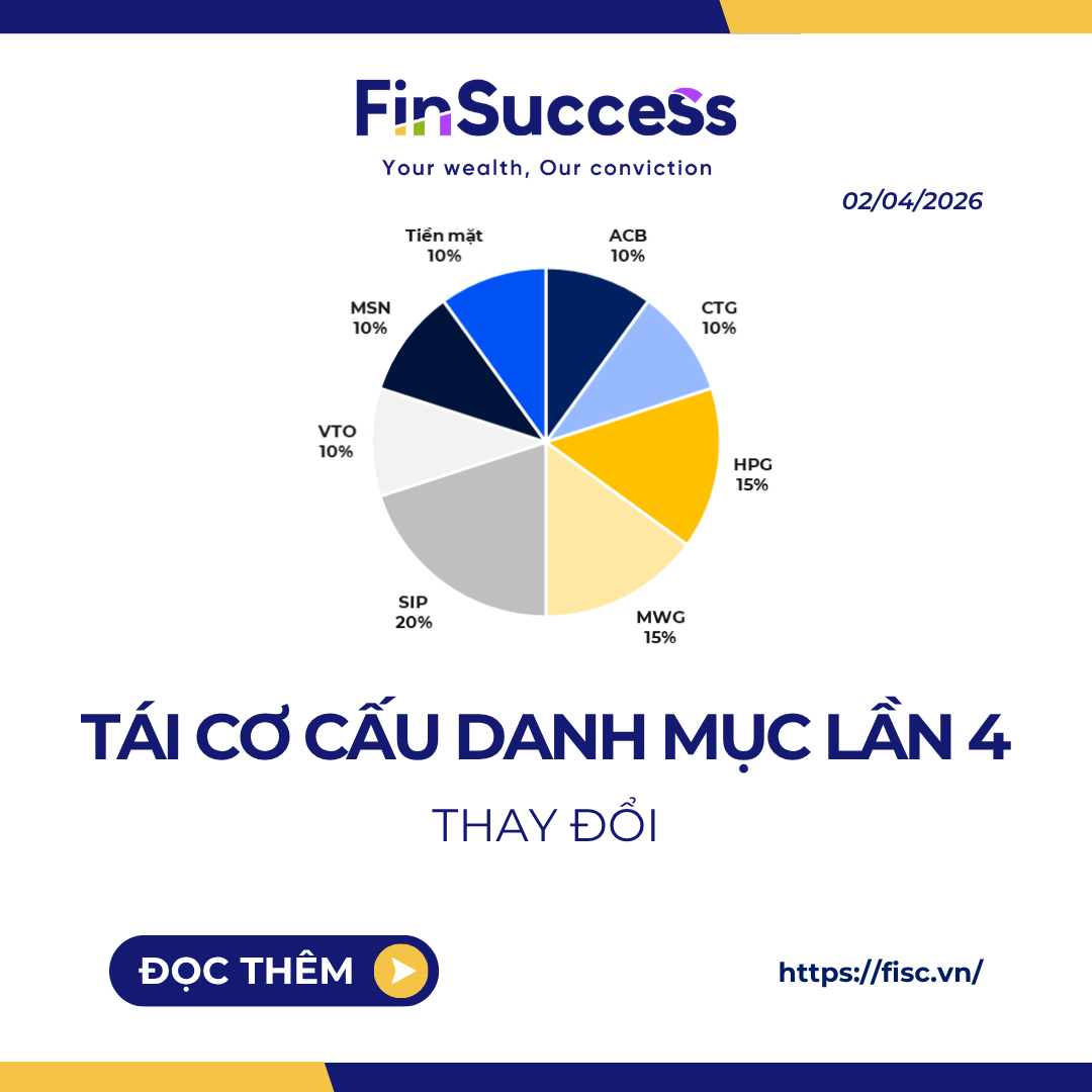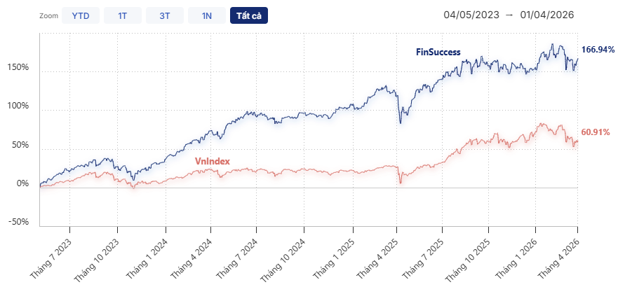 Tính đến thời điểm thực hiện đợt tái cơ cấu này, danh mục FinSuccess đã ghi nhận mức tăng trưởng ấn tượng 166.94%, vượt xa mức tăng 60.91% của VN-Index sau hơn hai năm, tương đương mức vượt trội 106.03%. Điều khiến đội ngũ FinSuccess đặc biệt tự hào không chỉ là hiệu suất cao, mà còn là khoảng cách vượt trội so với VN-Index ngày càng được nới rộng sau mỗi kỳ tái cơ cấu — minh chứng rõ ràng cho tính hiệu quả và kỷ luật trong chiến lược đầu tư. Chúng tôi cam kết sẽ tiếp tục nỗ lực không ngừng để duy trì phong độ và nâng cao hiệu quả đầu tư, qua đó mang lại giá trị bền vững và tối đa cho Quý Nhà đầu tư.