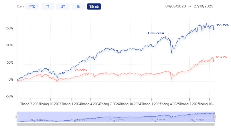Tính đến thời điểm thực hiện đợt tái cơ cấu này, danh mục FinSuccess đã ghi nhận mức tăng trưởng ấn tượng 155,75%, vượt xa mức tăng 61,75% của VN-Index sau hơn hai năm, tương đương mức vượt trội 94%. Điều khiến đội ngũ FinSuccess đặc biệt tự hào không chỉ là hiệu suất cao, mà còn là khoảng cách vượt trội so với VN-Index ngày càng được nới rộng sau mỗi kỳ tái cơ cấu — minh chứng rõ ràng cho tính hiệu quả và kỷ luật trong chiến lược đầu tư. Chúng tôi cam kết sẽ tiếp tục nỗ lực không ngừng để duy trì phong độ và nâng cao hiệu quả đầu tư, qua đó mang lại giá trị bền vững và tối đa cho Quý Nhà đầu tư.