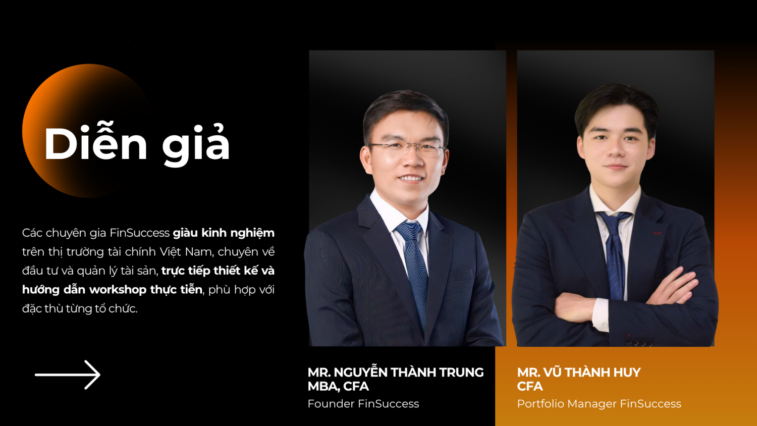 Các chuyên gia FinSuccess là những người có chuyên môn sâu và kinh nghiệm lâu năm trên thị trường tài chính Việt Nam, chuyên về đầu tư, quản lý tài sản và giáo dục tài chính. Họ trực tiếp thiết kế và hướng dẫn các workshop, mang đến kiến thức thực tế, hữu ích và phù hợp với đặc thù từng tổ chức.