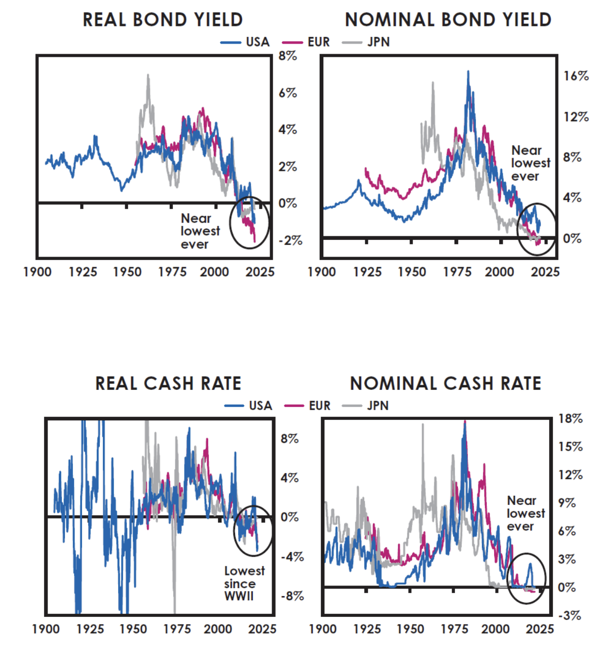 Các biểu đồ tôi trình bày trước đó để minh họa chu kỳ sẽ chưa đầy đủ nếu không có các biểu đồ lãi suất. Lãi suất được thể hiện trong bốn biểu đồ tiếp theo, bắt đầu từ năm 1900. (Lưu ý: Chương này được xuất bản lần đầu năm 2021 và các biểu đồ chỉ bao gồm dữ liệu đến thời điểm đó.) Các biểu đồ cho thấy lợi suất thực (đã điều chỉnh theo lạm phát) của trái phiếu, lợi suất danh nghĩa của trái phiếu, cũng như lãi suất tiền mặt danh nghĩa và thực tại Mỹ, châu Âu và Nhật Bản tại thời điểm tôi viết. Như có thể thấy, trước đây các mức này cao hơn nhiều, còn hiện nay đang ở mức rất thấp. Lợi suất thực của trái phiếu chính phủ bằng đồng tiền dự trữ tại thời điểm đó gần mức thấp nhất lịch sử, và lợi suất danh nghĩa trái phiếu quanh mức 0%, cũng gần mức thấp nhất từng ghi nhận. Lợi suất thực của tiền mặt thậm chí còn thấp hơn, dù chưa tiêu cực sâu như giai đoạn 1930–45 và 1915–20 — những thời kỳ tiền tệ hóa quy mô lớn. Lợi suất tiền mặt danh nghĩa cũng đang ở gần mức thấp nhất lịch sử.
