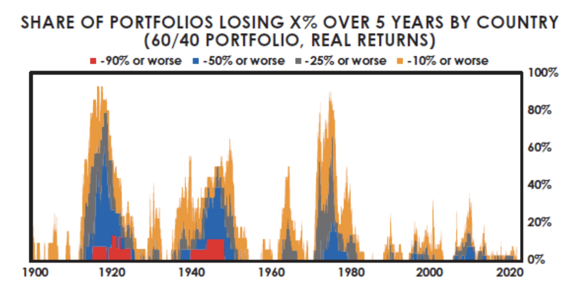 Có lẽ biểu đồ tiếp theo sẽ minh họa rõ ràng hơn, vì nó cho thấy tỷ lệ phần trăm các quốc gia ghi nhận thua lỗ đối với danh mục 60/40 cổ phiếu – trái phiếu trong các giai đoạn 5 năm.
