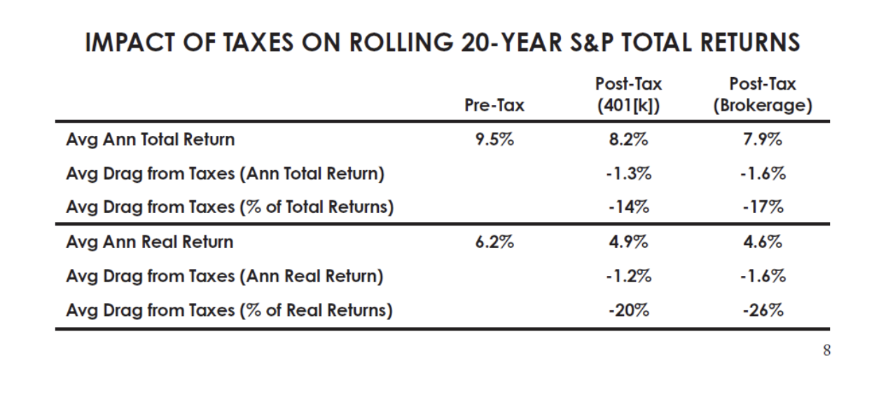 Về thuế, bảng này ước tính tác động bình quân của thuế đối với nhà đầu tư vào chỉ số S&P 500 trong tất cả các giai đoạn 20 năm (giả định áp dụng mức thuế suất trung bình của nhóm 20% thu nhập cao nhất hiện nay cho toàn bộ thời kỳ phân tích). Các cột khác nhau phản ánh các phương thức đầu tư khác nhau vào thị trường cổ phiếu Mỹ, bao gồm tài khoản hưu trí hoãn thuế (chỉ nộp thuế khi kết thúc kỳ đầu tư) và việc nắm giữ cổ phiếu trực tiếp, tái đầu tư cổ tức hằng năm như khi cổ phiếu được giữ trong tài khoản môi giới. Dù các hình thức này có tác động thuế khác nhau (trong đó tài khoản hưu trí chịu ảnh hưởng ít nhất), tất cả đều cho thấy mức tác động đáng kể, đặc biệt khi xét theo lợi suất thực — nơi thuế có thể bào mòn một phần lớn thành quả đầu tư. Trung bình trong mỗi giai đoạn 20 năm, nhà đầu tư Mỹ mất khoảng một phần tư lợi suất thực từ cổ phiếu do tác động của thuế.