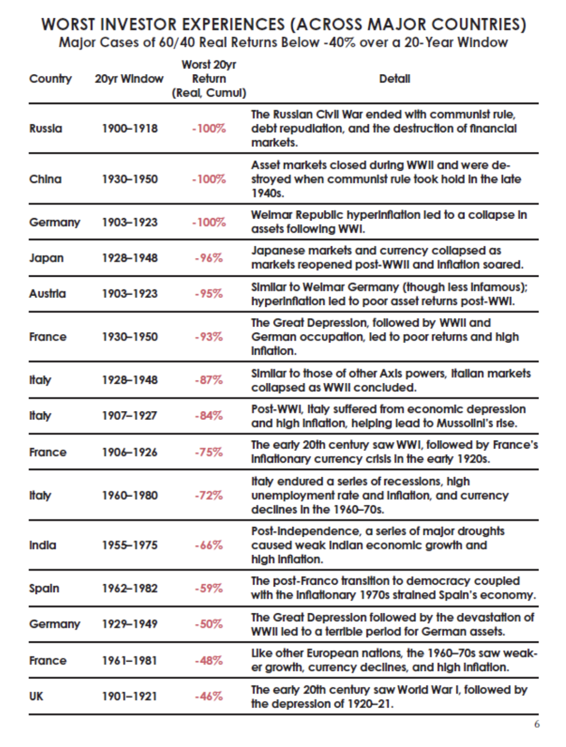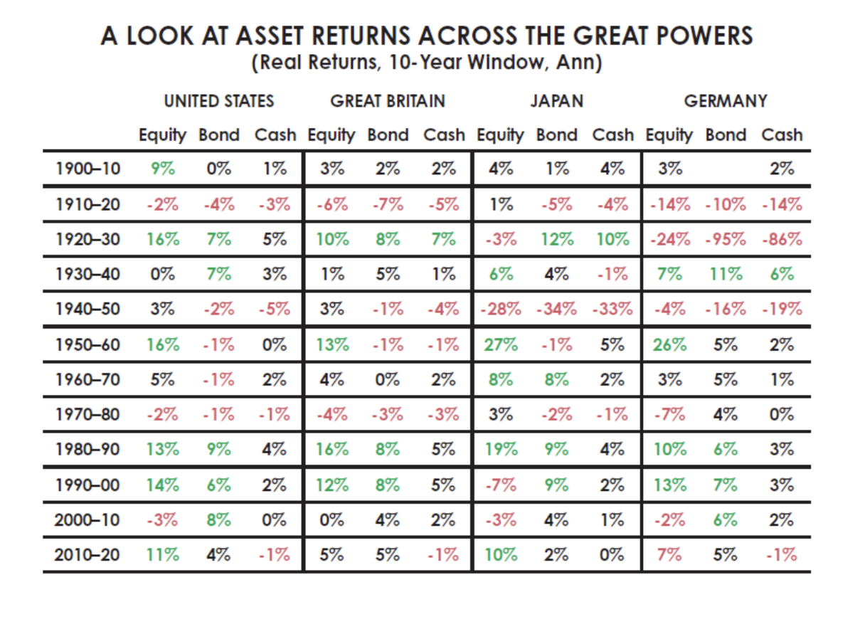 Tuy nhiên, bảy trong số mười quốc gia này đã chứng kiến tài sản gần như bị xóa sổ ít nhất một lần. Ngay cả những quốc gia không rơi vào tình trạng “xóa sổ hoàn toàn” cũng trải qua một số thập kỷ có lợi suất tài sản cực kỳ tồi tệ, gây tổn thất tài chính nghiêm trọng. Hai nền kinh tế phát triển lớn — Đức và Nhật Bản, vốn từng được xem là những “kèo cược sáng giá” ở nhiều thời điểm — đã bị phá hủy gần như toàn bộ tài sản và chịu tổn thất lớn về sinh mạng trong hai cuộc Thế chiến. Tôi cũng nhận thấy nhiều quốc gia khác có kết cục tương tự. Mỹ và Anh (cùng một vài quốc gia khác) là những trường hợp thành công đặc biệt, nhưng ngay cả họ cũng từng trải qua các giai đoạn hủy hoại tài sản ở quy mô lớn.