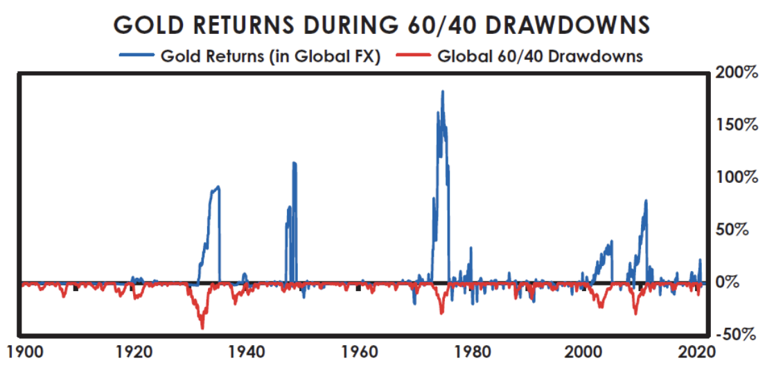 Như đã giải thích trước đó, trong các giai đoạn đồng tiền bị mất giá, tiền cứng (hard money) và tài sản hữu hình có xu hướng tăng giá trị tương đối so với tiền mặt. Ví dụ, biểu đồ tiếp theo cho thấy những giai đoạn mà danh mục 60/40 cổ phiếu – trái phiếu suy giảm giá trị cũng là những giai đoạn giá vàng tăng lên. Tôi không đưa ra nhận định rằng vàng là khoản đầu tư tốt hay xấu. Tôi chỉ đang mô tả cơ chế vận hành của kinh tế và thị trường, cũng như cách các cơ chế đó đã thể hiện trong biến động thị trường và lợi suất đầu tư trong quá khứ, nhằm chia sẻ góc nhìn của tôi về những gì đã xảy ra, những gì có thể xảy ra và vì sao.