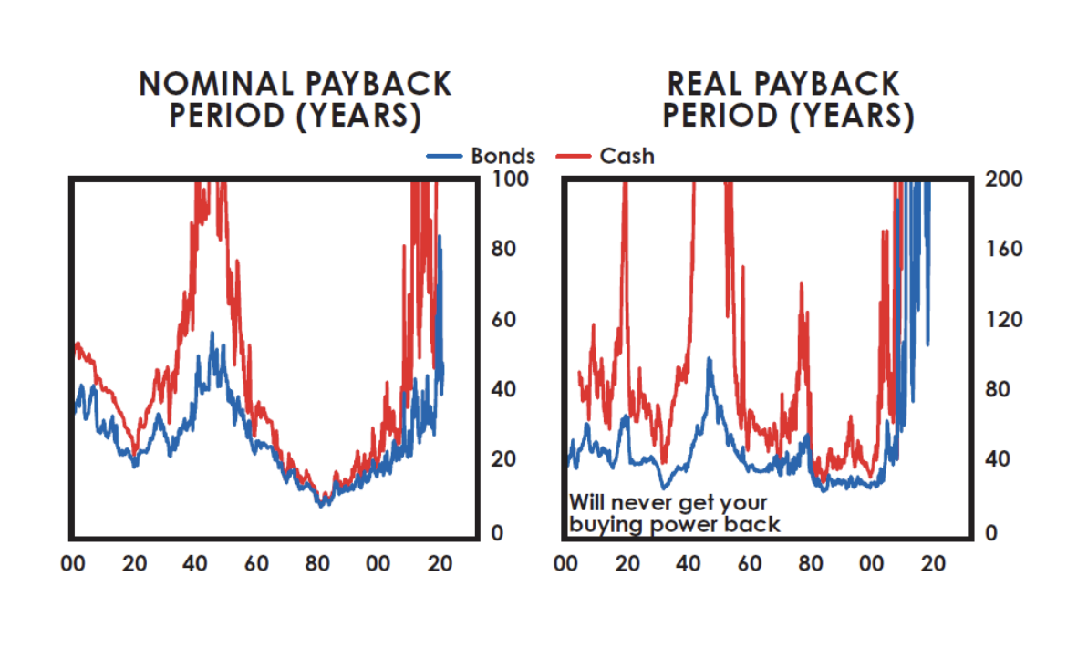 Điều này có ý nghĩa gì đối với đầu tư? Mục đích của đầu tư là nắm giữ tiền trong một phương tiện lưu trữ giá trị để có thể chuyển đổi thành sức mua vào một thời điểm trong tương lai. Khi đầu tư, bạn bỏ ra một khoản tiền hiện tại để đổi lấy các khoản thanh toán trong tương lai. Hãy xem “thỏa thuận” đó, tại thời điểm tôi viết những dòng này, trông như thế nào. Nếu bạn bỏ ra 100 USD hôm nay, bạn phải chờ bao nhiêu năm để thu hồi lại 100 USD đó và sau đó mới bắt đầu nhận phần lợi nhuận vượt lên trên số vốn ban đầu? Với trái phiếu tại Mỹ, Nhật Bản, Trung Quốc và châu Âu, bạn có thể phải chờ lần lượt khoảng 45 năm, 150 năm và 30 năm để lấy lại tiền gốc (nhiều khả năng chỉ nhận được mức lợi suất danh nghĩa rất thấp hoặc gần như bằng không), và tại châu Âu vào thời điểm này, bạn có thể sẽ không bao giờ thu hồi được tiền gốc do lãi suất danh nghĩa âm. Tuy nhiên, vì mục tiêu là bảo toàn sức mua, bạn còn phải tính đến lạm phát. Tại thời điểm này, ở Mỹ và châu Âu, bạn có thể sẽ không bao giờ lấy lại được sức mua ban đầu (và ở Nhật Bản có thể mất hơn 250 năm). Thực tế, tại những quốc gia có lãi suất thực âm này, gần như chắc chắn sức mua của bạn trong tương lai sẽ thấp hơn hiện tại. Thay vì chấp nhận mức lợi suất thấp hơn lạm phát, tại sao không mua các tài sản hữu hình — bất kỳ tài sản nào — có khả năng tăng ít nhất bằng hoặc cao hơn lạm phát? Tôi nhìn thấy nhiều khoản đầu tư mà tôi kỳ vọng sẽ vượt xa mức lạm phát. Các biểu đồ dưới đây thể hiện thời gian hoàn vốn khi nắm giữ tiền mặt và trái phiếu tại Mỹ, xét cả theo danh nghĩa và theo thực. Như có thể thấy, đây là mức dài nhất từng ghi nhận và rõ ràng là một khoảng thời gian phi lý.