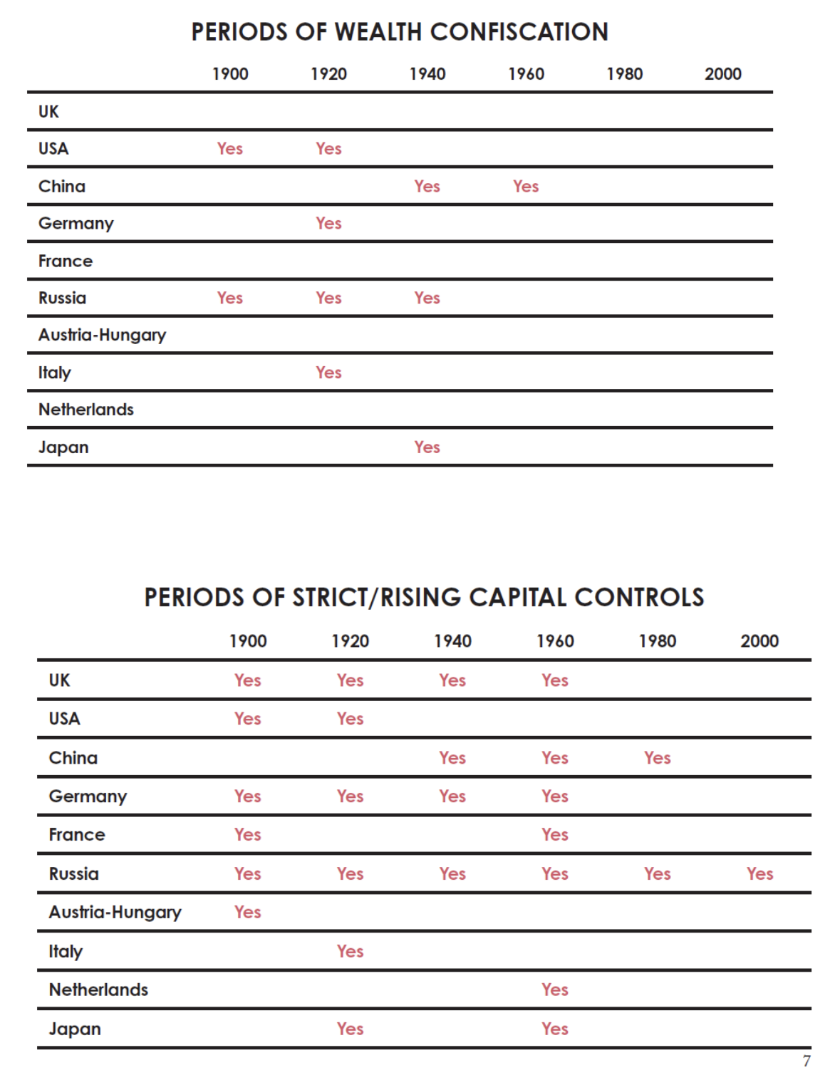 Ngoài ra, tác động đến tài sản từ việc tịch thu tài sản, đánh thuế mang tính tịch thu, kiểm soát vốn và việc thị trường bị đóng cửa là vô cùng lớn. Phần lớn nhà đầu tư ngày nay không biết đến những điều này và cho rằng chúng khó xảy ra, bởi họ không thể thấy chúng khi nhìn lại vài thập kỷ gần đây. Bảng dưới đây cho thấy những thập kỷ mà các sự kiện này đã xảy ra. Tự nhiên, những trường hợp tịch thu tài sản nghiêm trọng nhất diễn ra trong các giai đoạn có khoảng cách giàu nghèo lớn và xung đột nội bộ về tài sản khi điều kiện kinh tế trở nên xấu đi và/hoặc khi có chiến tranh.