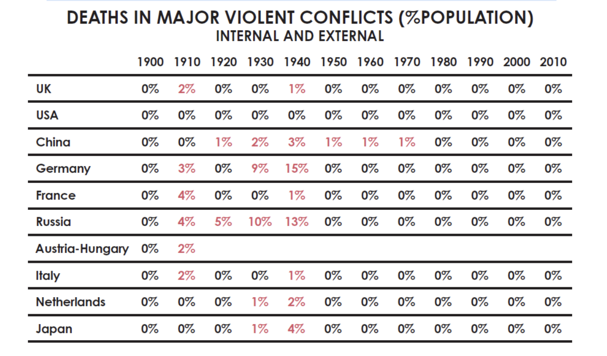 Ngày nay, nhiều người cho rằng Thế chiến I hẳn đã dễ dàng dự báo trong những năm trước khi nó xảy ra, nhưng thực tế không phải vậy. Trước chiến tranh, đã có khoảng 50 năm hầu như không có xung đột giữa các cường quốc lớn trên thế giới. Trong 50 năm đó, thế giới trải qua tốc độ đổi mới và tăng trưởng năng suất cao nhất từng thấy, dẫn đến sự giàu có và thịnh vượng to lớn. Toàn cầu hóa đạt mức cao mới, với kim ngạch xuất khẩu toàn cầu tăng lên nhiều lần trong 50 năm trước Thế chiến I. Các quốc gia liên kết với nhau hơn bao giờ hết. Mỹ, Pháp, Đức, Nhật Bản và Áo–Hung là những đế chế đang trỗi dậy nhanh chóng, chứng kiến sự tiến bộ công nghệ chóng mặt. Anh vẫn là cường quốc thống trị toàn cầu. Nga đang công nghiệp hóa nhanh chóng. Trong số các quốc gia được nêu trong bảng về những trải nghiệm đầu tư tồi tệ nhất, chỉ có Trung Quốc là rõ ràng đang suy thoái. Các liên minh vững chắc giữa các cường quốc châu Âu khi đó được xem là phương tiện duy trì hòa bình và cân bằng quyền lực. Bước vào năm 1900, mọi thứ trông có vẻ rất tốt đẹp, ngoại trừ việc khoảng cách giàu nghèo và sự bất mãn gia tăng, và nợ nần đã trở nên lớn. Từ năm 1900 đến 1914, những điều kiện này trở nên tồi tệ hơn và căng thẳng quốc tế gia tăng. Sau đó là các giai đoạn lợi suất tồi tệ mà tôi vừa mô tả.