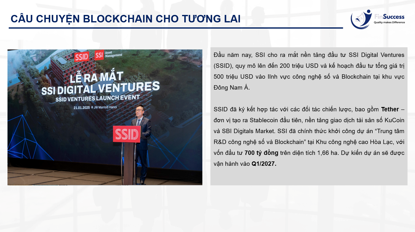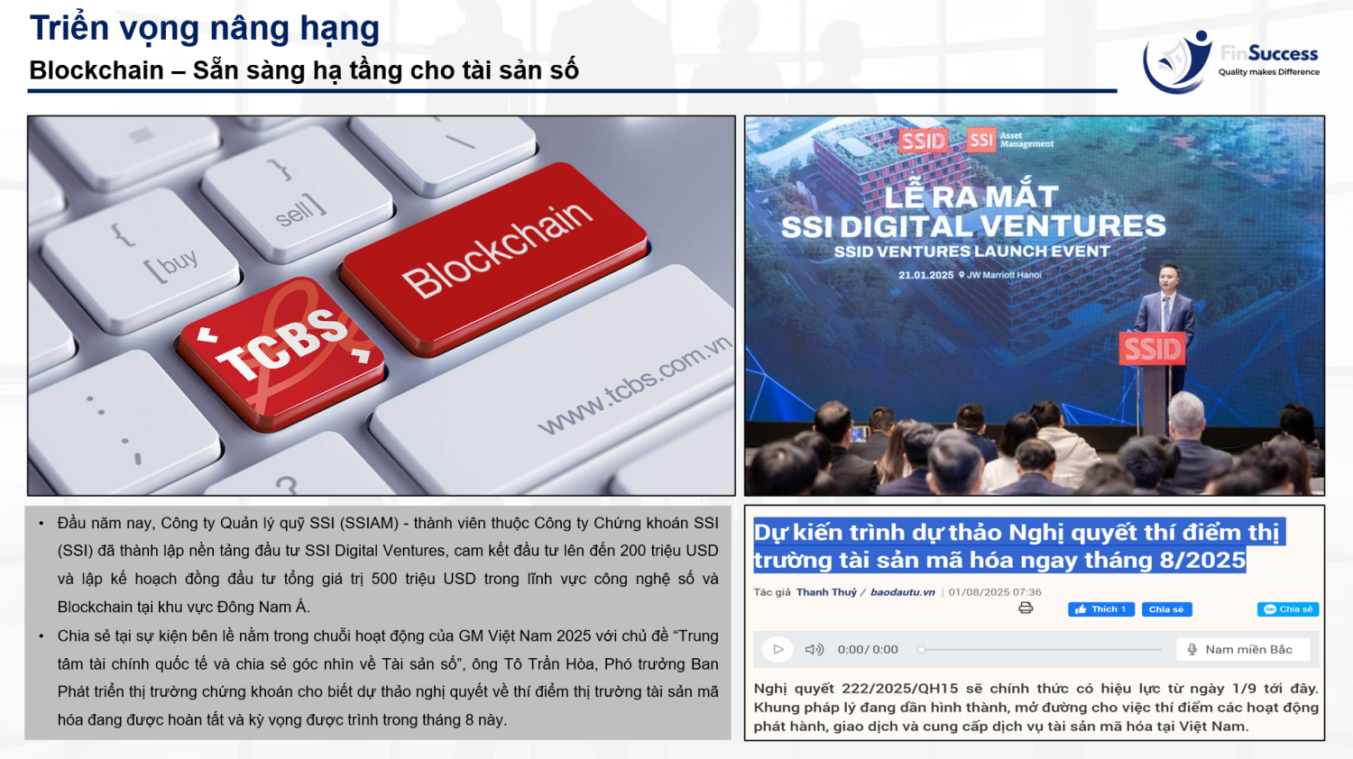 Đầu năm nay, Công ty Quản lý quỹ SSI (SSIAM) - thành viên thuộc Công ty Chứng khoán SSI (SSI) đã thành lập nền tảng đầu tư SSI Digital Ventures, cam kết đầu tư lên đến 200 triệu USD và lập kế hoạch đồng đầu tư tổng giá trị 500 triệu USD trong lĩnh vực công nghệ số và Blockchain tại khu vực Đông Nam Á. Chia sẻ tại sự kiện bên lề nằm trong chuỗi hoạt động của GM Việt Nam 2025 với chủ đề “Trung tâm tài chính quốc tế và chia sẻ góc nhìn về Tài sản số”, ông Tô Trần Hòa, Phó trưởng Ban Phát triển thị trường chứng khoán cho biết dự thảo nghị quyết về thí điểm thị trường tài sản mã hóa đang được hoàn tất và kỳ vọng được trình trong tháng 8 này.
