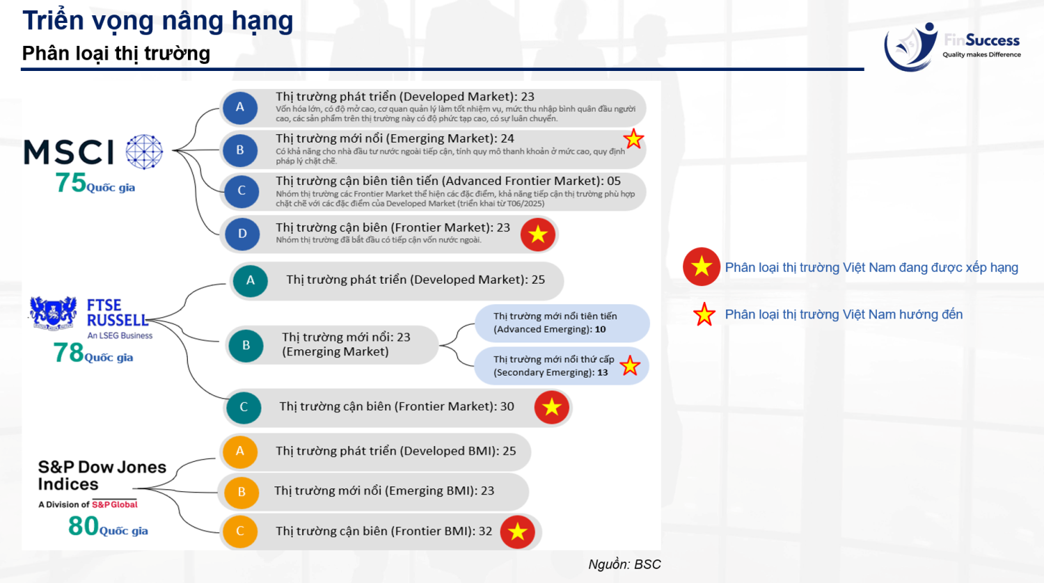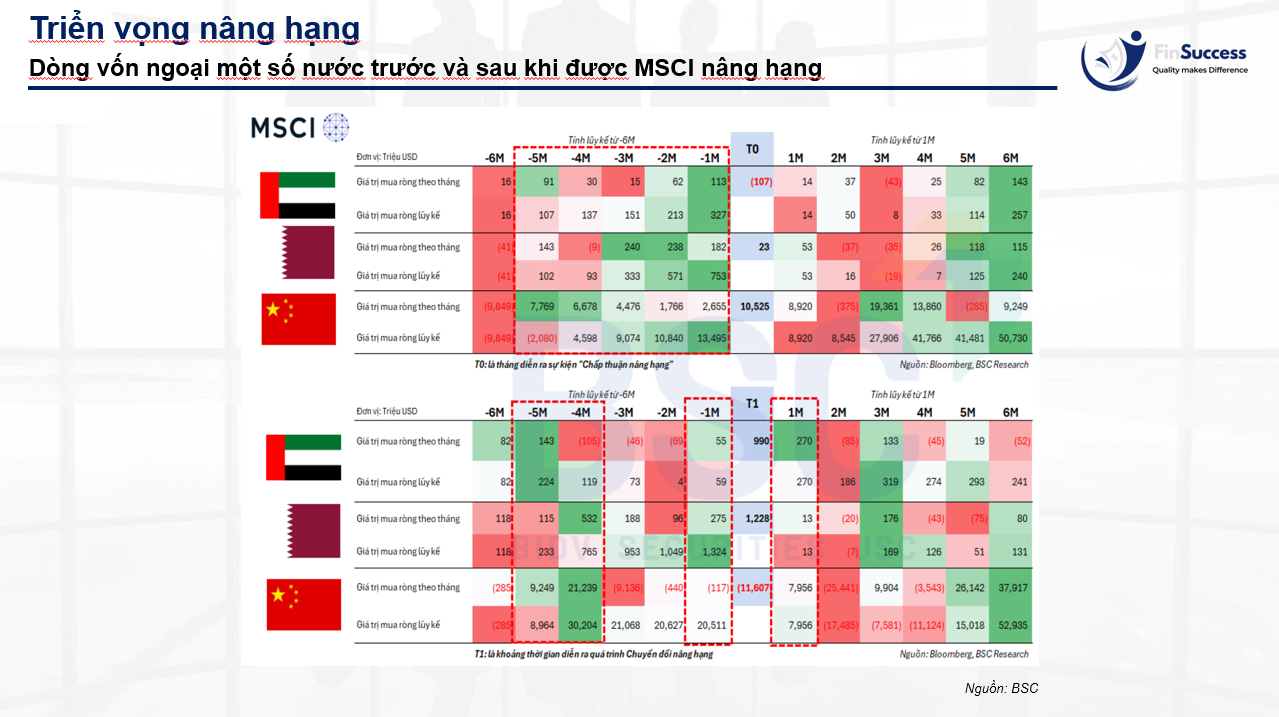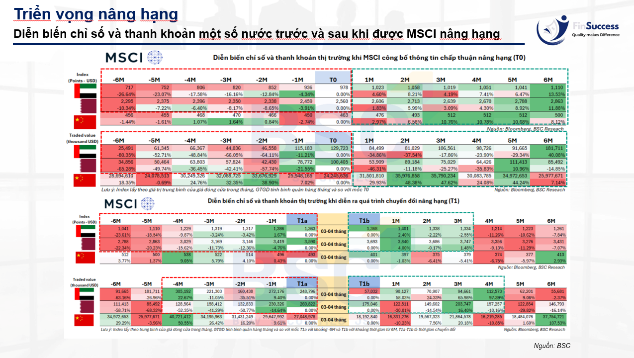 Quá trình nâng hạng thị trường chứng khoán theo MSCI thường diễn ra qua ba giai đoạn chính. Đầu tiên là giai đoạn T0, khi MSCI chính thức công bố quyết định nâng hạng. Đây là thời điểm thị trường phản ứng mạnh với thông tin, thường ghi nhận sự tăng trưởng về chỉ số và thanh khoản do kỳ vọng tích cực từ nhà đầu tư. Tiếp theo là giai đoạn T1a, tức là giai đoạn đầu của quá trình chuyển đổi. Trong thời gian này, các quỹ đầu tư chủ động bắt đầu cơ cấu lại danh mục, chuẩn bị đưa các cổ phiếu phù hợp vào chỉ số MSCI. Dòng tiền bắt đầu dịch chuyển nhưng chưa quá mạnh, thị trường có thể dao động nhẹ hoặc tích lũy. Cuối cùng là giai đoạn T1b, khi quá trình chuyển đổi gần hoàn tất. Đây là lúc các quỹ thụ động như ETF bắt buộc phải giải ngân để mua đủ tỷ trọng cổ phiếu theo chỉ số mới. Thị trường thường ghi nhận mức tăng mạnh về giá và thanh khoản, do áp lực mua lớn trong thời gian ngắn.