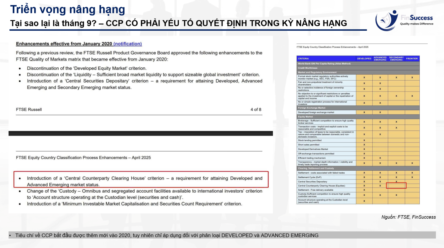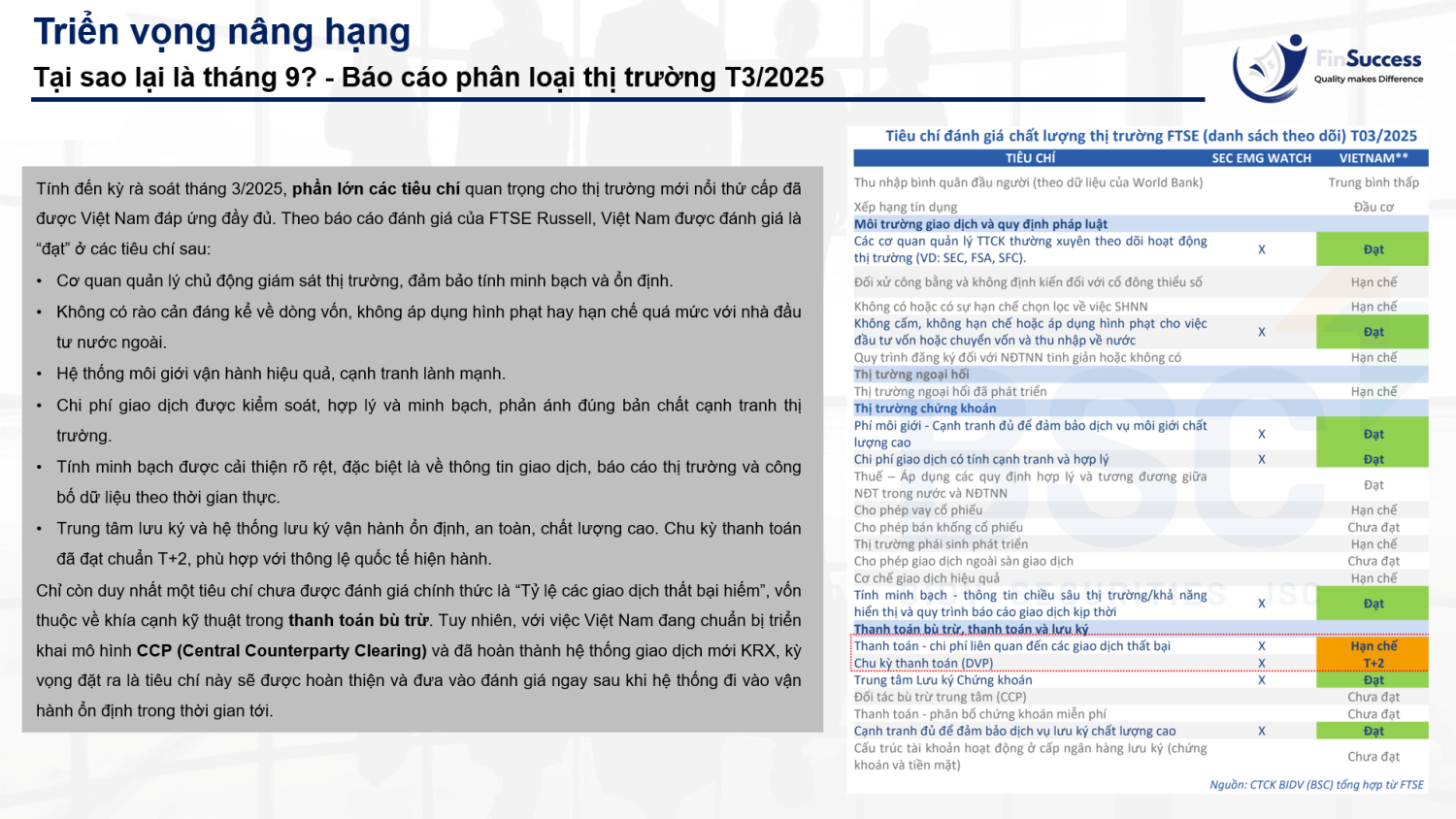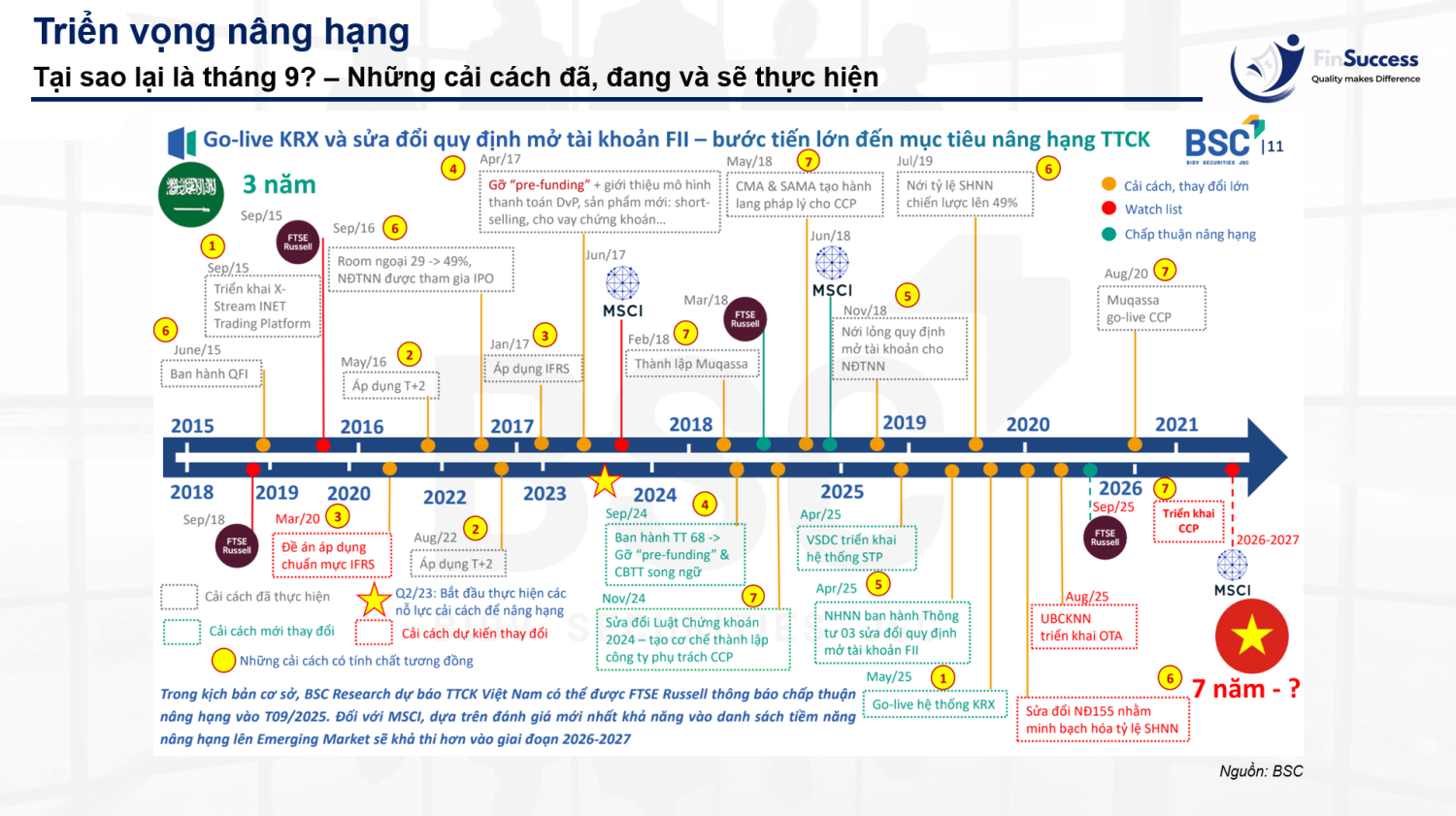 Quá trình nâng hạng thị trường chứng khoán theo MSCI thường diễn ra qua ba giai đoạn chính. Đầu tiên là giai đoạn T0, khi MSCI chính thức công bố quyết định nâng hạng. Đây là thời điểm thị trường phản ứng mạnh với thông tin, thường ghi nhận sự tăng trưởng về chỉ số và thanh khoản do kỳ vọng tích cực từ nhà đầu tư. Tiếp theo là giai đoạn T1a, tức là giai đoạn đầu của quá trình chuyển đổi. Trong thời gian này, các quỹ đầu tư chủ động bắt đầu cơ cấu lại danh mục, chuẩn bị đưa các cổ phiếu phù hợp vào chỉ số MSCI. Dòng tiền bắt đầu dịch chuyển nhưng chưa quá mạnh, thị trường có thể dao động nhẹ hoặc tích lũy. Cuối cùng là giai đoạn T1b, khi quá trình chuyển đổi gần hoàn tất. Đây là lúc các quỹ thụ động như ETF bắt buộc phải giải ngân để mua đủ tỷ trọng cổ phiếu theo chỉ số mới. Thị trường thường ghi nhận mức tăng mạnh về giá và thanh khoản, do áp lực mua lớn trong thời gian ngắn.