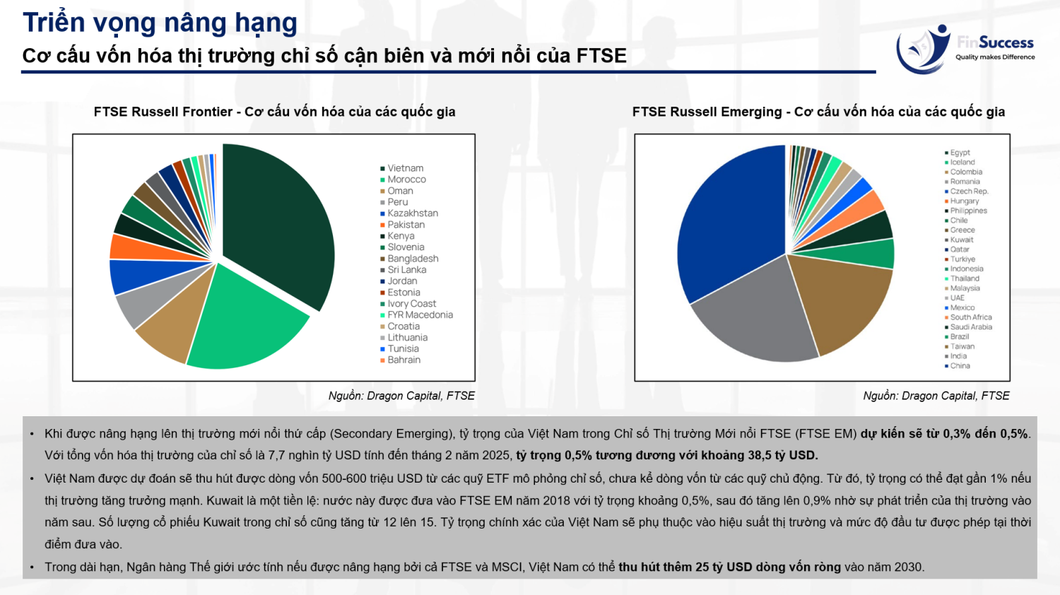 Khi được nâng hạng lên thị trường mới nổi thứ cấp (Secondary Emerging), tỷ trọng của Việt Nam trong Chỉ số Thị trường Mới nổi FTSE (FTSE EM) dự kiến sẽ từ 0,3% đến 0,5%. Với tổng vốn hóa thị trường của chỉ số là 7,7 nghìn tỷ USD tính đến tháng 2 năm 2025, tỷ trọng 0,5% tương đương với khoảng 38,5 tỷ USD. Việt Nam được dự đoán sẽ thu hút được dòng vốn 500-600 triệu USD từ các quỹ ETF mô phỏng chỉ số, chưa kể dòng vốn từ các quỹ chủ động. Từ đó, tỷ trọng có thể đạt gần 1% nếu thị trường tăng trưởng mạnh. Kuwait là một tiền lệ: nước này được đưa vào FTSE EM năm 2018 với tỷ trọng khoảng 0,5%, sau đó tăng lên 0,9% nhờ sự phát triển của thị trường vào năm sau. Số lượng cổ phiếu Kuwait trong chỉ số cũng tăng từ 12 lên 15. Tỷ trọng chính xác của Việt Nam sẽ phụ thuộc vào hiệu suất thị trường và mức độ đầu tư được phép tại thời điểm đưa vào. Trong dài hạn, Ngân hàng Thế giới ước tính nếu được nâng hạng bởi cả FTSE và MSCI, Việt Nam có thể thu hút thêm 25 tỷ USD dòng vốn ròng vào năm 2030.