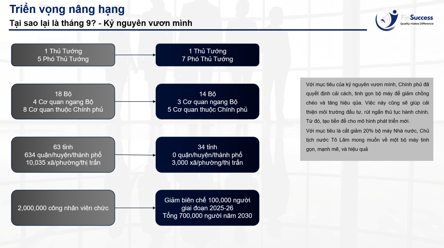 Với mục tiêu của kỷ nguyên vươn mình, Chính phủ đã quyết định cải cách, tinh gọn bộ máy để giảm chồng chéo và tăng hiệu qủa. Việc này cũng sẽ giúp cải thiện môi trường đầu tư, rút ngắn thủ tục hành chính. Từ đó, tạo tiền đề cho mô hình phát triển mới.