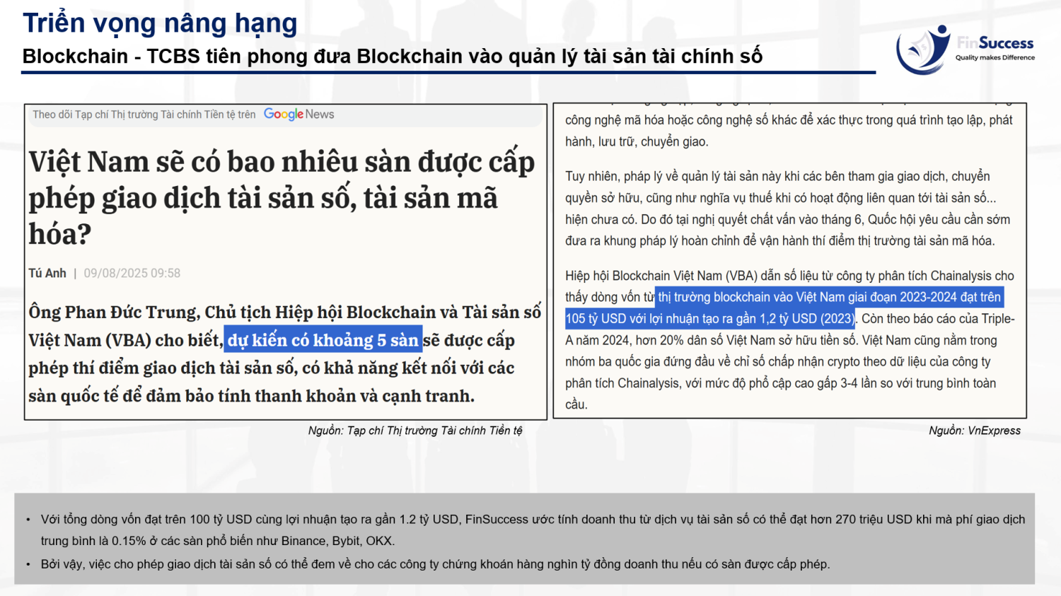 Với tổng dòng vốn đạt trên 100 tỷ USD cùng lợi nhuận tạo ra gần 1.2 tỷ USD, FinSuccess ước tính doanh thu từ dịch vụ tài sản số có thể đạt hơn 270 triệu USD khi mà phí giao dịch trung bình là 0.15% ở các sàn phổ biến như Binance, Bybit, OKX. Bởi vậy, việc cho phép giao dịch tài sản số có thể đem về cho các công ty chứng khoán hàng nghìn tỷ đồng doanh thu nếu có sàn được cấp phép.