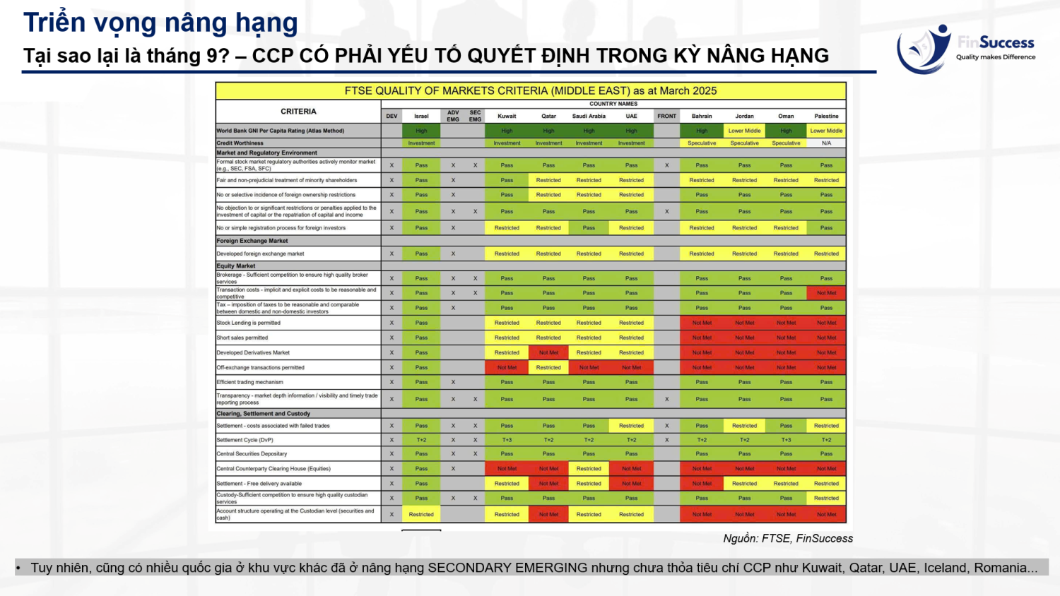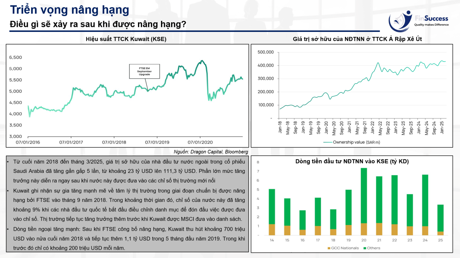 Từ cuối năm 2018 đến tháng 3/2025, giá trị sở hữu của nhà đầu tư nước ngoài trong cổ phiếu Saudi Arabia đã tăng gần gấp 5 lần, từ khoảng 23 tỷ USD lên 111,3 tỷ USD. Phần lớn mức tăng trưởng này diễn ra ngay sau khi nước này được đưa vào các chỉ số thị trường mới nổi Kuwait ghi nhận sự gia tăng mạnh mẽ về tâm lý thị trường trong giai đoạn chuẩn bị được nâng hạng bởi FTSE vào tháng 9 năm 2018. Trong khoảng thời gian đó, chỉ số của nước này đã tăng khoảng 9% khi các nhà đầu tư quốc tế bắt đầu điều chỉnh danh mục để đón đầu việc được đưa vào chỉ số. Thị trường tiếp tục tăng trưởng thêm trước khi Kuwait được MSCI đưa vào danh sách. Dòng tiền ngoại tăng mạnh: Sau khi FTSE công bố nâng hạng, Kuwait thu hút khoảng 700 triệu USD vào nửa cuối năm 2018 và tiếp tục thêm 1,1 tỷ USD trong 5 tháng đầu năm 2019. Trong khi trước đó chỉ có khoảng 200 triệu USD mỗi năm.