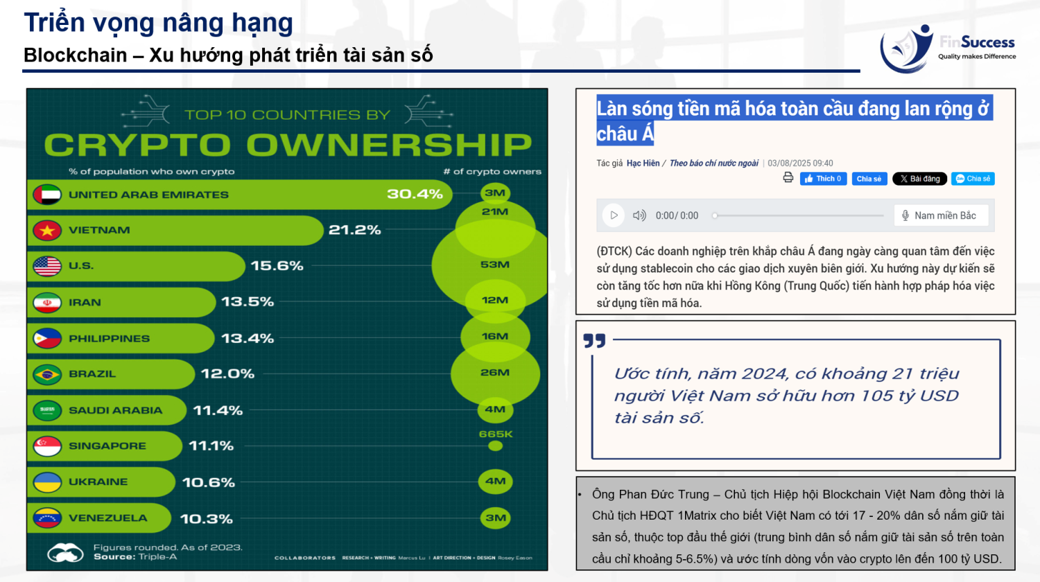 Ông Phan Đức Trung – Chủ tịch Hiệp hội Blockchain Việt Nam đồng thời là Chủ tịch HĐQT 1Matrix cho biết Việt Nam có tới 17 - 20% dân số nắm giữ tài sản số, thuộc top đầu thế giới (trung bình dân số nắm giữ tài sản số trên toàn cầu chỉ khoảng 5-6.5%) và ước tính dòng vốn vào crypto lên đến 100 tỷ USD.