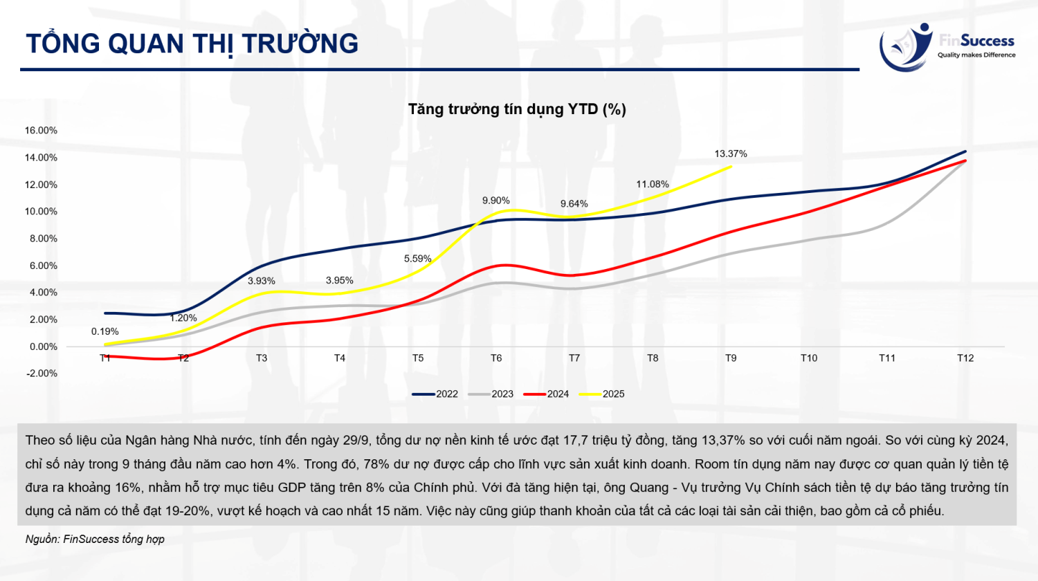 Theo số liệu của Ngân hàng Nhà nước, tính đến ngày 29/9, tổng dư nợ nền kinh tế ước đạt 17,7 triệu tỷ đồng, tăng 13,37% so với cuối năm ngoái. So với cùng kỳ 2024, chỉ số này trong 9 tháng đầu năm cao hơn 4%. Trong đó, 78% dư nợ được cấp cho lĩnh vực sản xuất kinh doanh. Room tín dụng năm nay được cơ quan quản lý tiền tệ đưa ra khoảng 16%, nhằm hỗ trợ mục tiêu GDP tăng trên 8% của Chính phủ. Với đà tăng hiện tại, ông Quang - Vụ trưởng Vụ Chính sách tiền tệ dự báo tăng trưởng tín dụng cả năm có thể đạt 19-20%, vượt kế hoạch và cao nhất 15 năm. Việc này cũng giúp thanh khoản của tất cả các loại tài sản cải thiện, bao gồm cả cổ phiếu.
