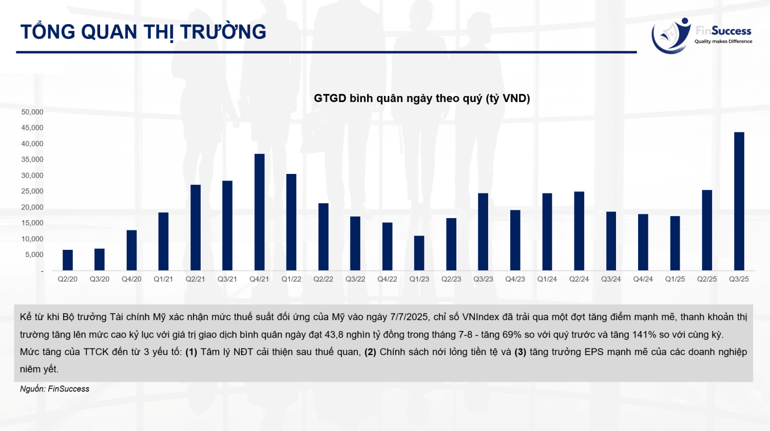 Kể từ khi Bộ trưởng Tài chính Mỹ xác nhận mức thuế suất đối ứng của Mỹ vào ngày 7/7/2025, chỉ số VNIndex đã trải qua một đợt tăng điểm mạnh mẽ, thanh khoản thị trường tăng lên mức cao kỷ lục với giá trị giao dịch bình quân ngày đạt 43,8 nghìn tỷ đồng trong tháng 7-8 - tăng 69% so với quý trước và tăng 141% so với cùng kỳ.