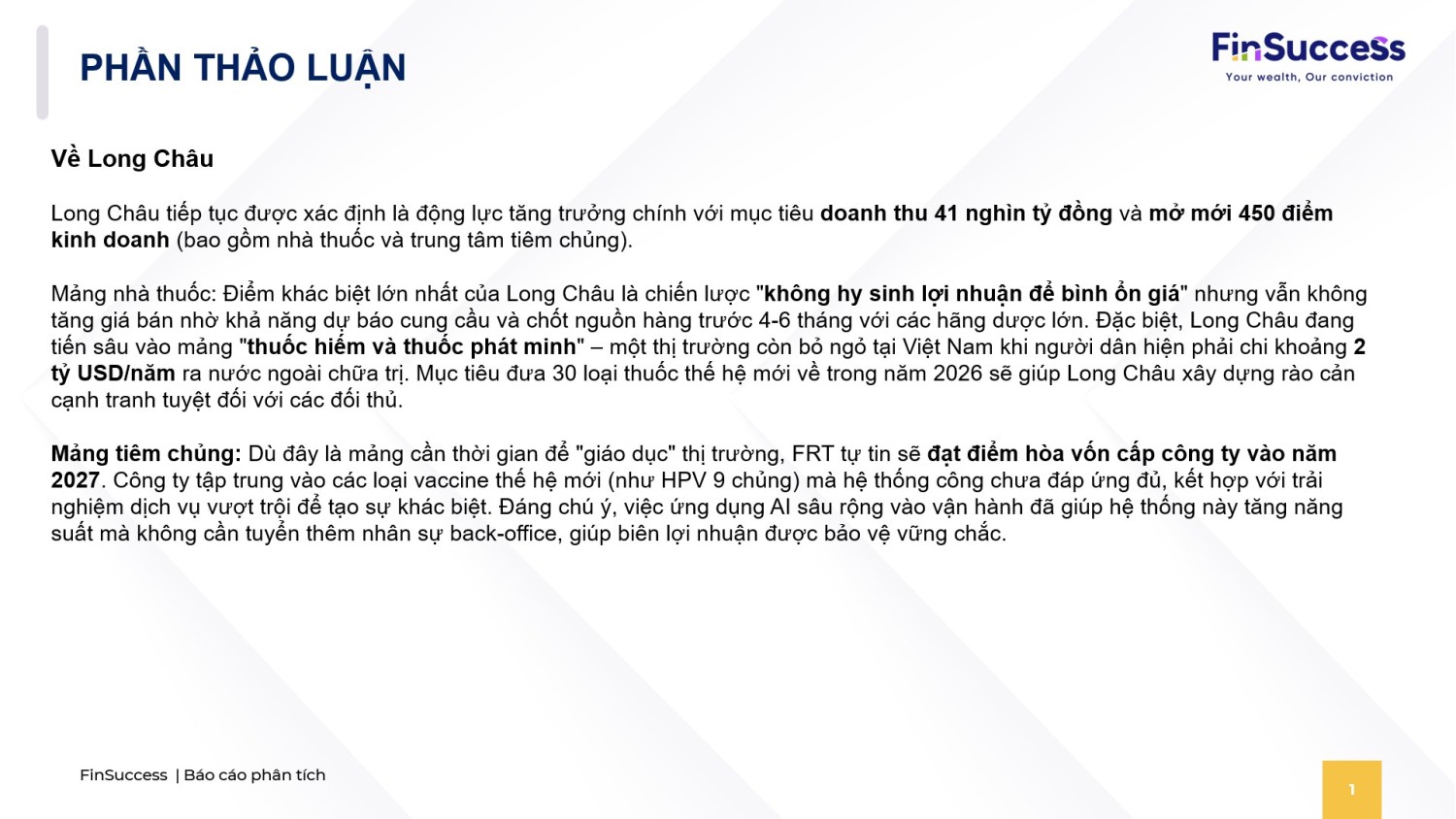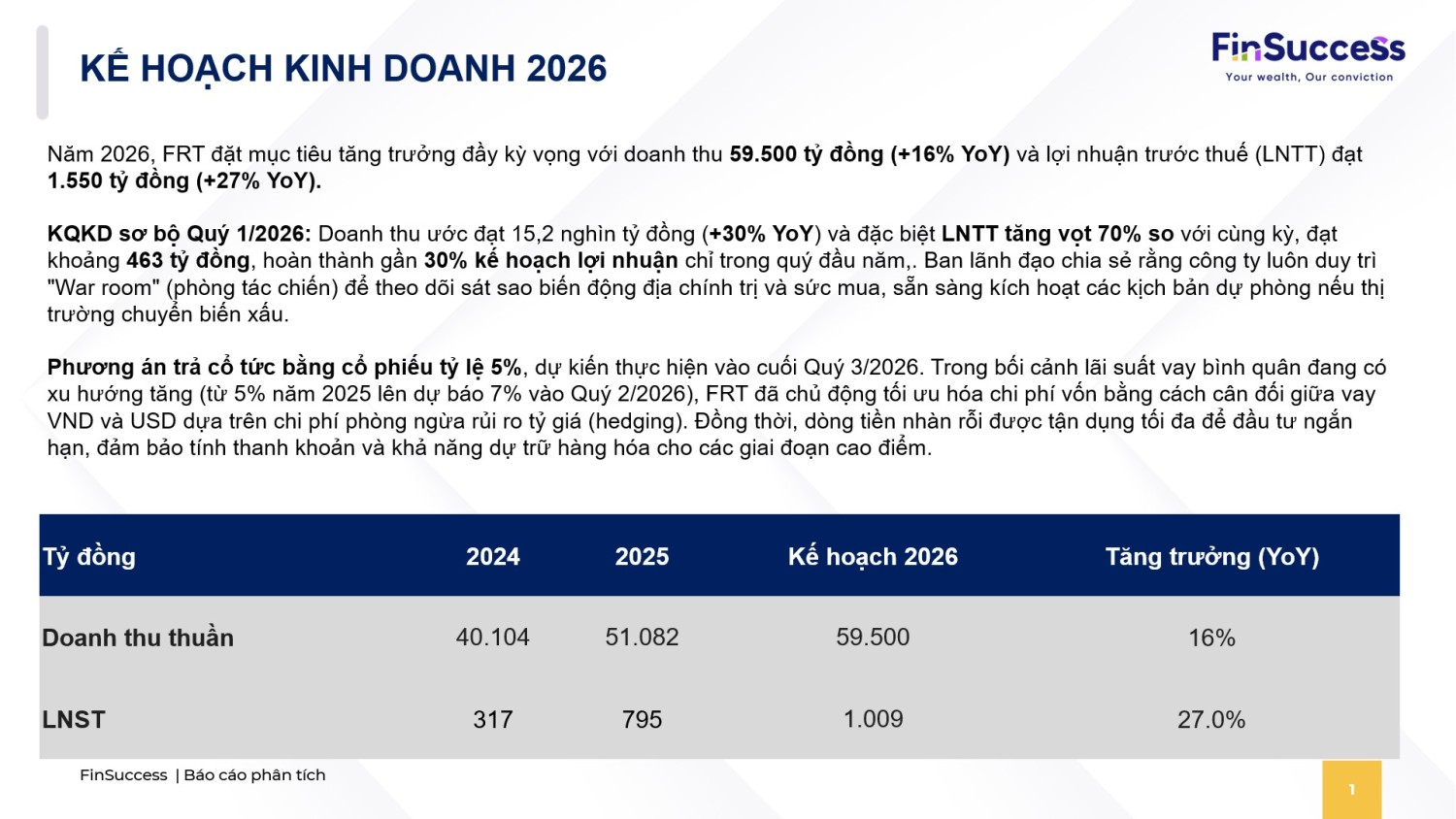 ĐHCĐ FRT: Q1/26 LNTT +70% ấn tượng. KH 2026: DT +16%, LNTT +27%. Cổ tức 5% CP. Long Châu (Trọng tâm): mở 450 điểm, thuốc hiếm, Tiêm chủng hòa vốn 2027. FPT Shop: chuyển sang Điện máy, Drone, Sim FPT. Điểm nhấn: Ứng dụng AI toàn diện tối ưu chi phí & tăng năng suất. FRT vào giai đoạn bứt phá lợi nhuận.