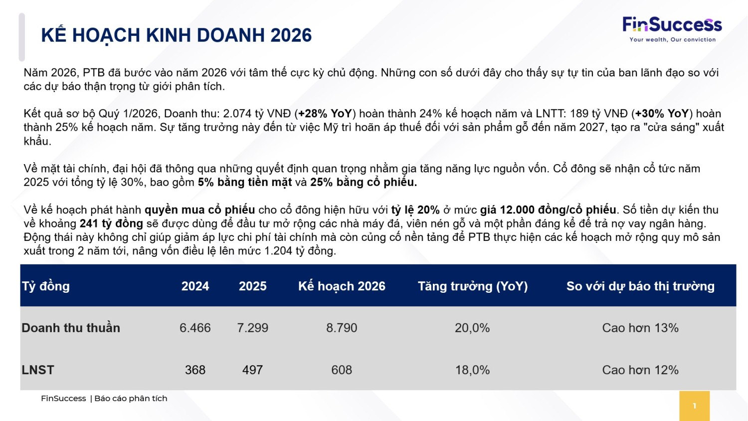 ĐHĐCĐ PTB 2026: Q1 lãi tăng 30%, vượt xa dự báo. Kế hoạch năm tham vọng +18% nhờ gỗ xuất khẩu và đá thạch anh. Tăng vốn qua cổ tức 30% và quyền mua giá 12k. P/E 7.8x rẻ, tiềm năng tăng giá 19%.