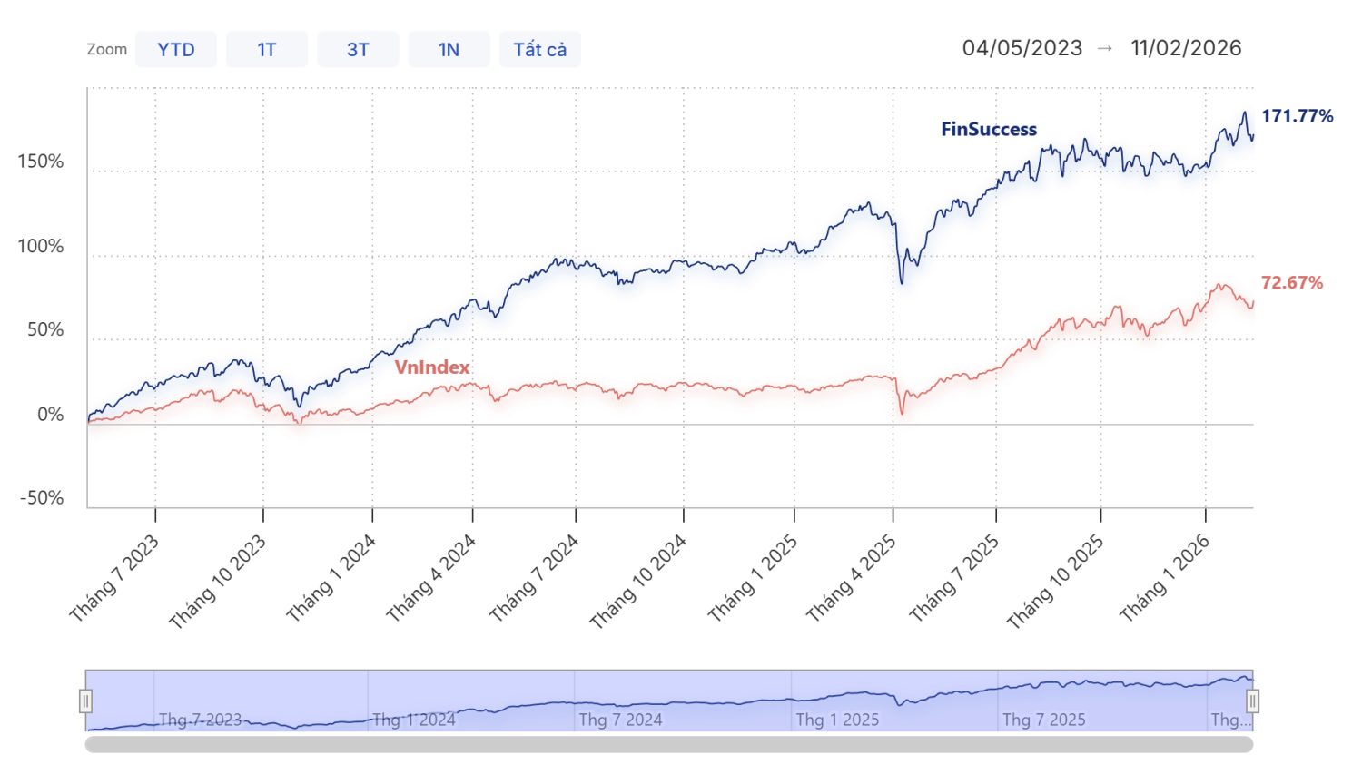 Tính đến thời điểm thực hiện đợt tái cơ cấu này, danh mục FinSuccess đã ghi nhận mức tăng trưởng ấn tượng 171.77%, vượt xa mức tăng 72.67% của VN-Index sau hơn hai năm, tương đương mức vượt trội 99.1%. Điều khiến đội ngũ FinSuccess đặc biệt tự hào không chỉ là hiệu suất cao, mà còn là khoảng cách vượt trội so với VN-Index ngày càng được nới rộng sau mỗi kỳ tái cơ cấu — minh chứng rõ ràng cho tính hiệu quả và kỷ luật trong chiến lược đầu tư. Chúng tôi cam kết sẽ tiếp tục nỗ lực không ngừng để duy trì phong độ và nâng cao hiệu quả đầu tư, qua đó mang lại giá trị bền vững và tối đa cho Quý Nhà đầu tư.